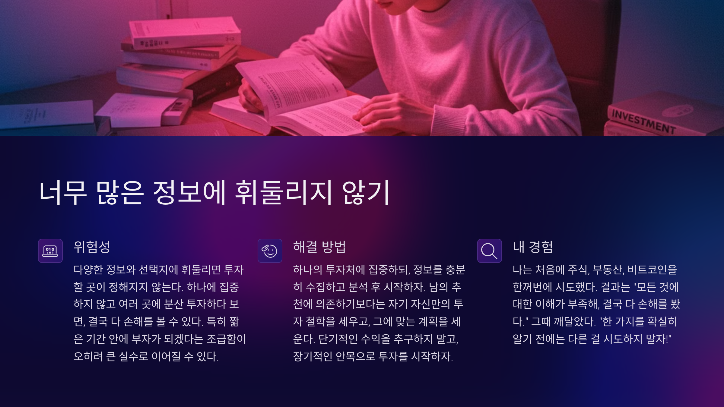 하나의 투자처에 집중하되, 정보를 충분히 수집하고 분석 후 시작하자.