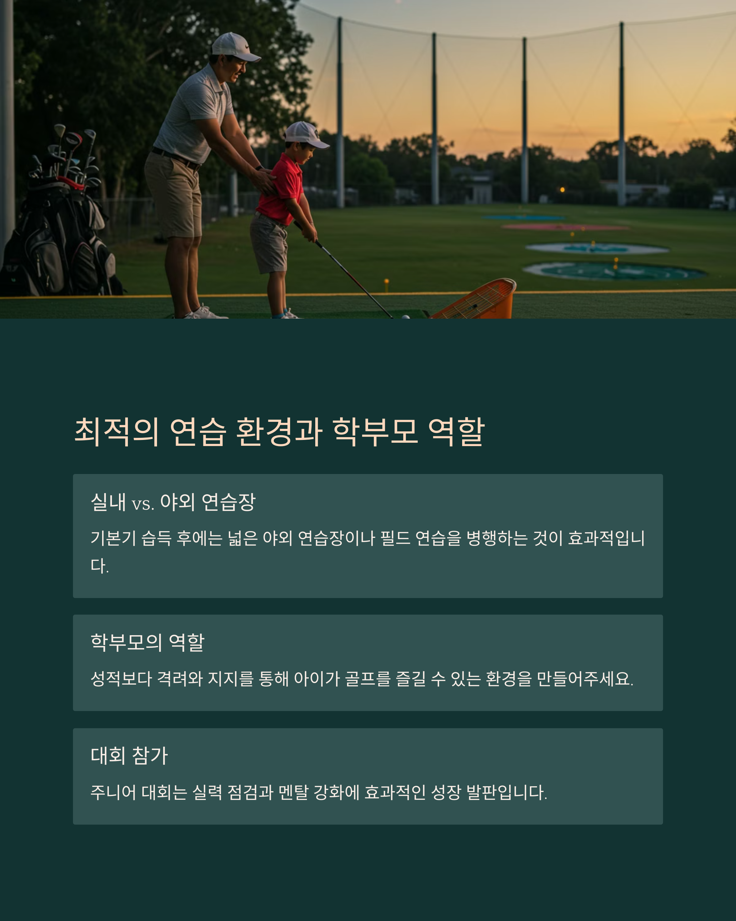 주니어 골프의 성패는 학부모님의 역할에 달려있다고 해도 과언이 아닙니다. 자녀가 골프를 진정으로 즐기면서 성장할 수 있도록 긍정적인 환경을 만들어주는 것이 매우 중요합니다. 간혹 학부모님들이 성적에만 지나치게 집중하거나 자녀를 압박하여 오히려 골프에 대한 흥미를 잃게 만드는 경우가 있습니다.